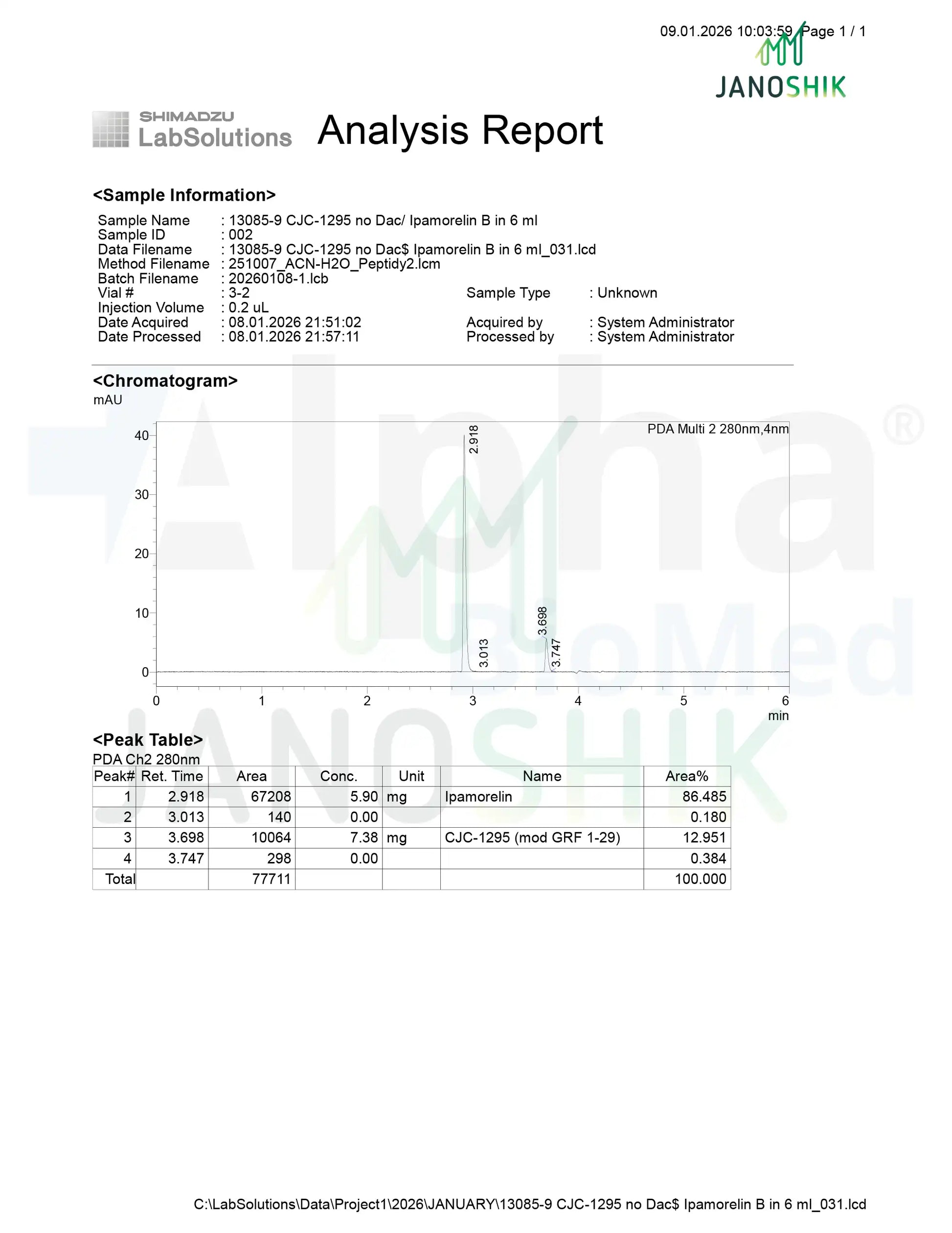 - A 1:1 blend of CJC-1295 No DAC (5mg) and Ipamorelin (5mg) designed to optimize growth hormone (GH) release, promoting muscle growth, fat loss, and enhanced tissue repair.