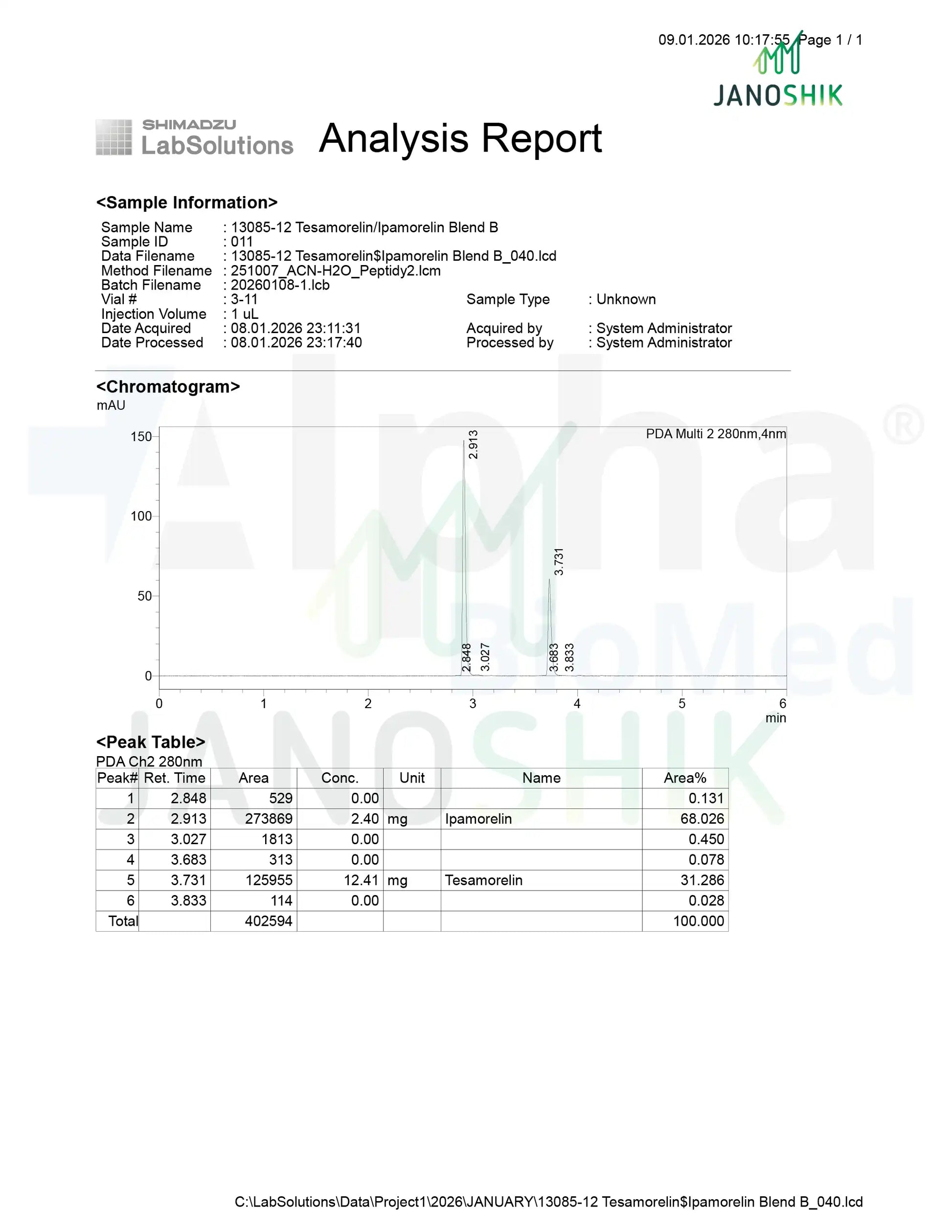 - This dual-peptide formulation provides a research tool for evaluating combined GH secretagogue effects on metabolic, endocrine, and cellular repair pathways.