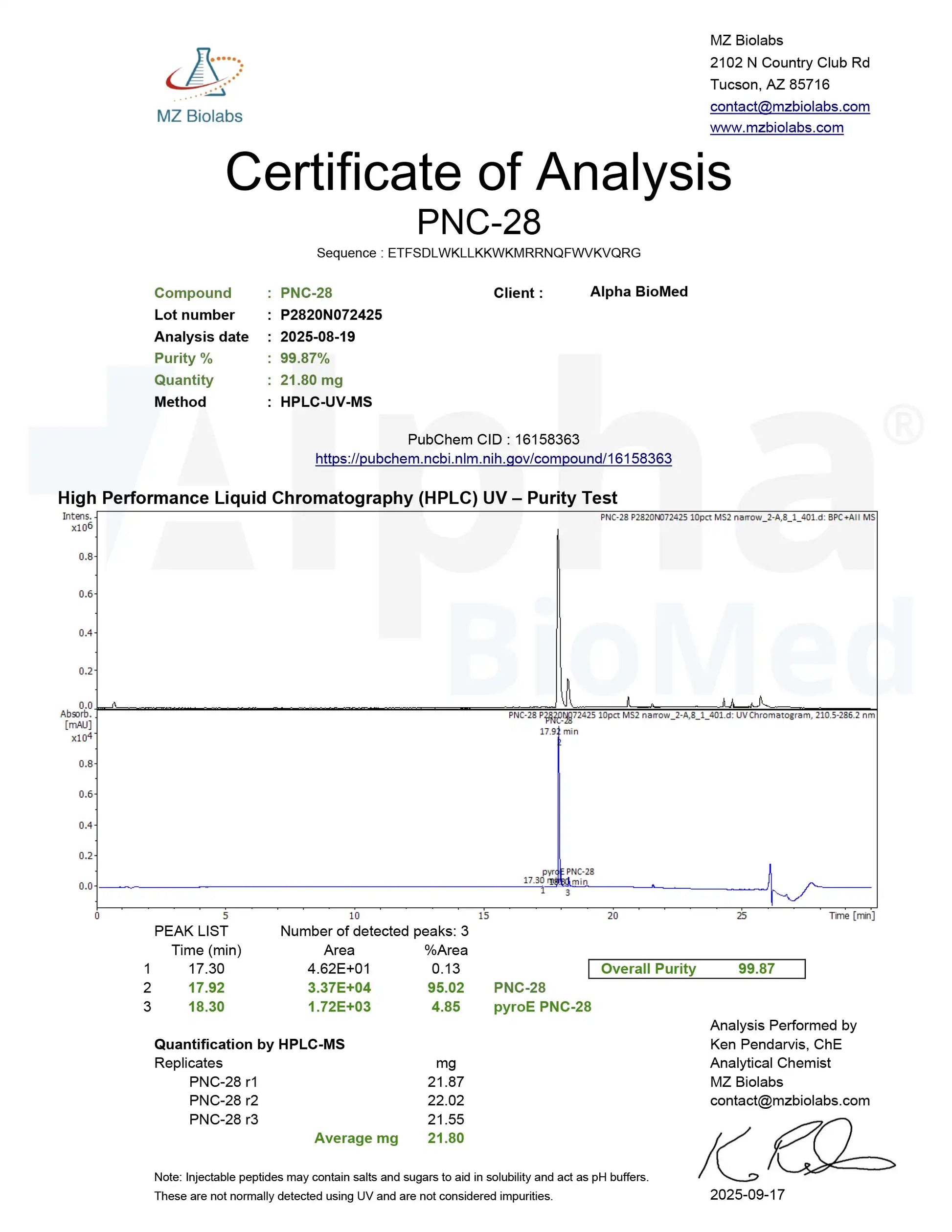 - PNC-28 (20mg) is a synthetic peptide derived from a mitochondrial targeting sequence of p53, designed to investigate selective apoptotic mechanisms in malignant cell models. This peptide functions by interacting with mitochondrial membranes in transformed cell populations, making it a promising research tool for studies focused on cancer biology and targeted peptide therapeutics.